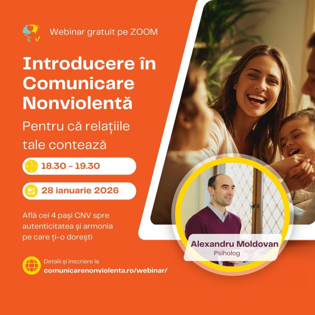 Răspuns: în CNV nu „rezolvăm conflictul” direct, ci începem prin a vedea ce se întâmplă, ce simțim și ce avem nevoie fiecare. Observăm faptele, ne exprimăm trăirile, legăm de nevoi și formulăm o cerere clară, realistă . De multe ori, simplul fapt că ieșim din reproș și intrăm în asumarea de sine scade tonul și creează spațiu de ascultare.