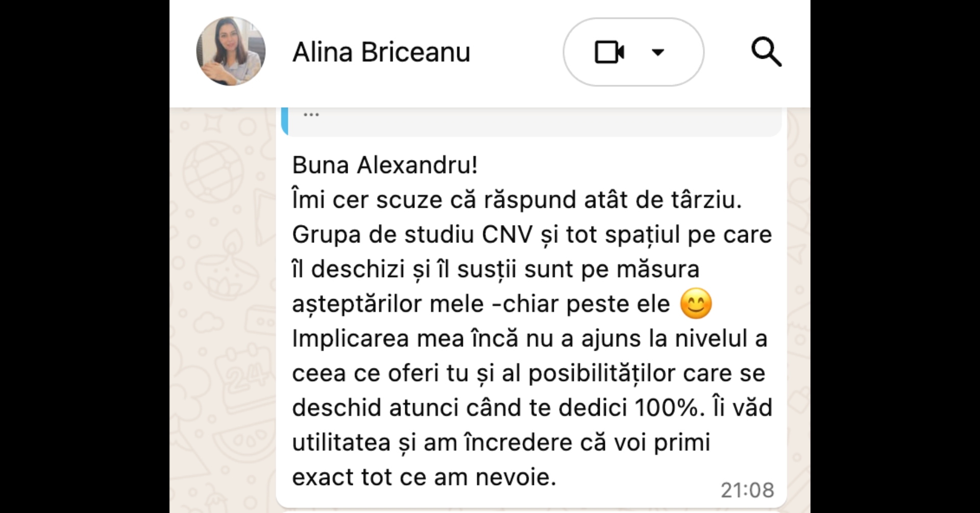 „Dacă, în următoarele 3 luni după curs, te lovești de o situație de conflict în care nu știi cum să aplici CNV, ai inclusă o sesiune online de ‘intervenție de urgență’ de 30 de minute, în care lucrăm direct pe cazul tău.”