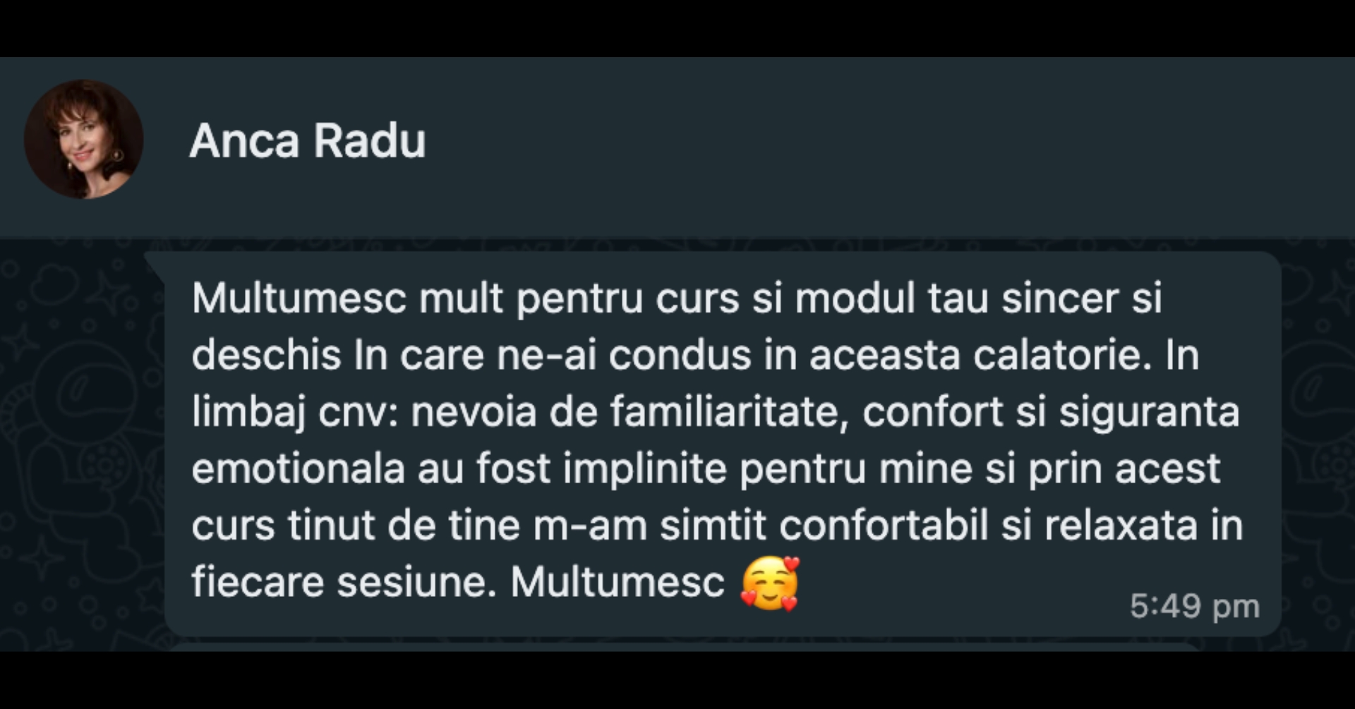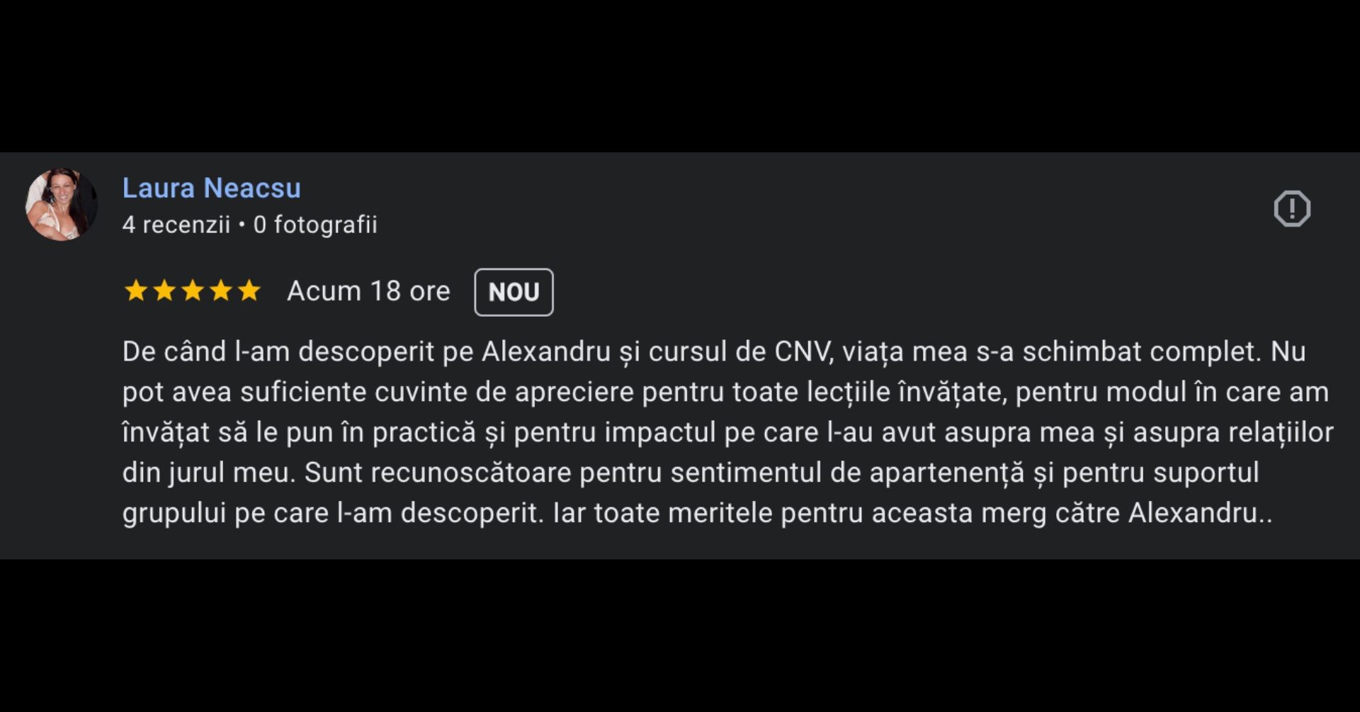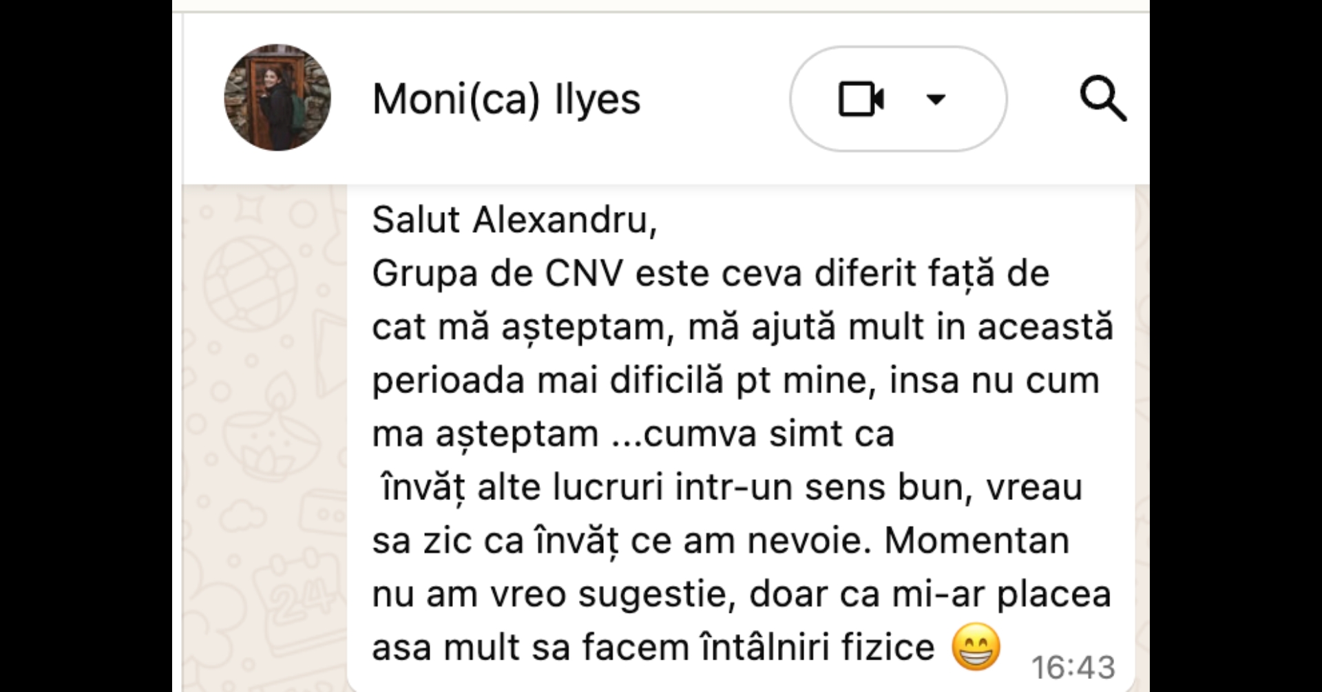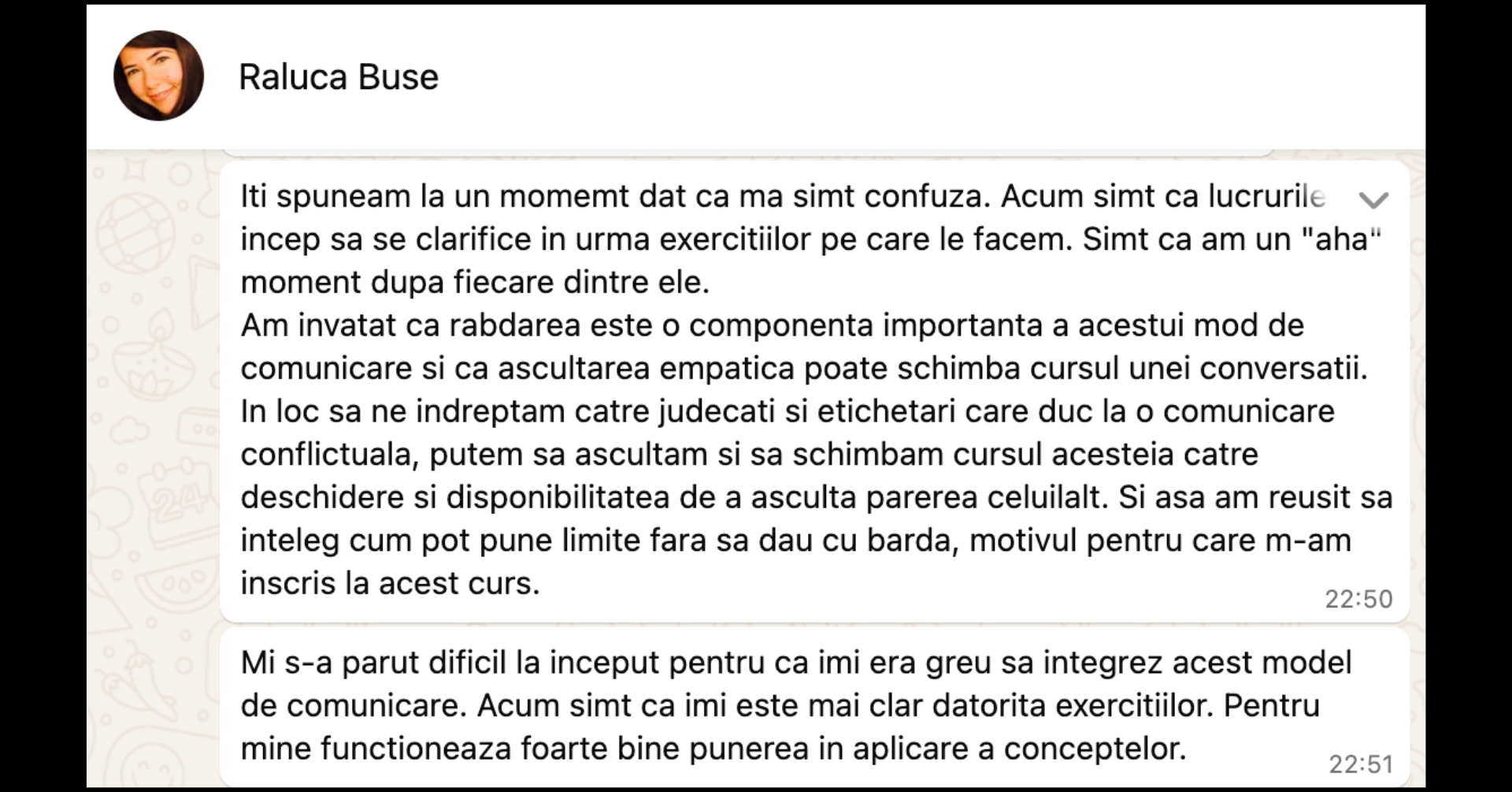 ”O experiență care m-a adus mai aproape de mine, care m-a învățat să fiu mai bună cu mine și cu cei din jurul meu. Am conștientizat că CNV nu e despre cum să rezolvi conflictele, ci este despre cum să fiu în pace cu mine. În urma cursului simt cum în relația mea de cuplu sunt mai prezentă, mai empatică, mai plină de iubire.”