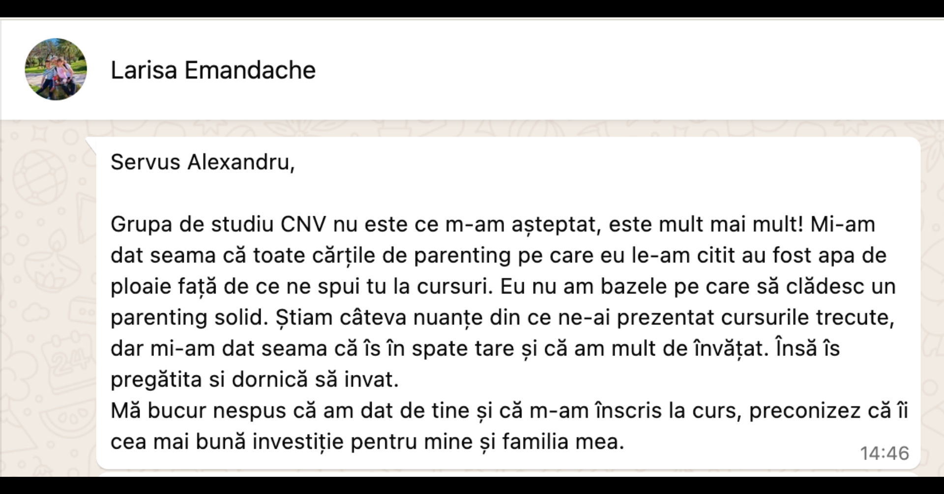 ”Dacă aș fi avut norocul să învăț CNV la 25 de ani în loc de 40, aș fi câștigat mult mai multă armonie în relațiile mele. Comunicarea nonviolentă este un proces extraordinar care mi-a transformat complet modul în care percep relațiile. Am câștigat aici prieteni pe viață, am învățat să mă exprim autentic și să ascult empatic. Aș recomanda CNV și pe Alexandru oricui își dorește să își îmbunătățească relațiile și viața.”