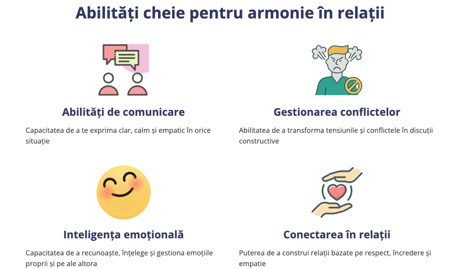 ◉ Raportul tău personalizat — scorul tău la cele 4 abilități, recomandări practice de formulare și exerciții concrete ușor de aplicat în conversațiile tale importante