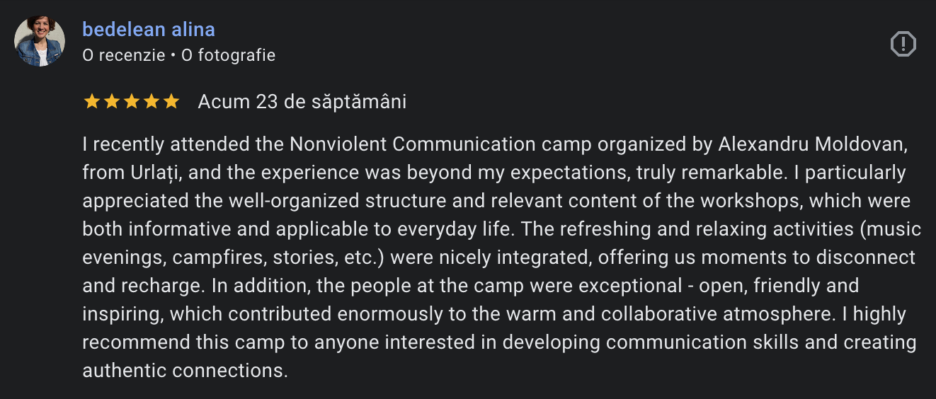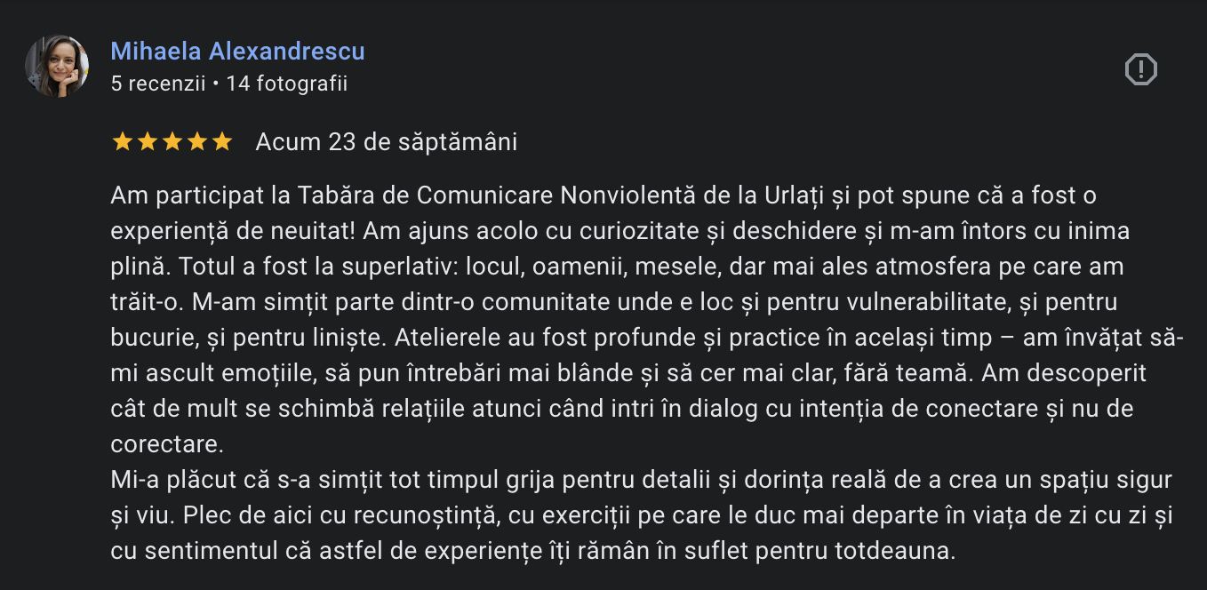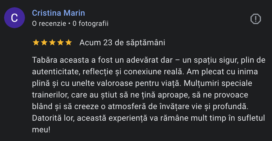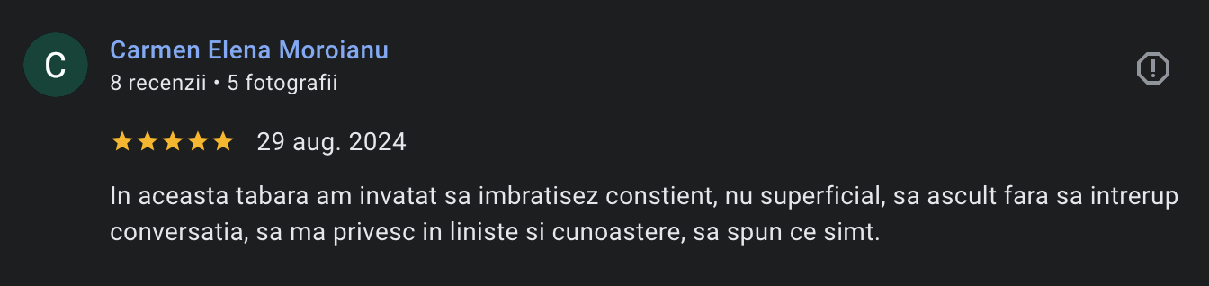 Te invit la Tabăra de Relații Autentice, un retreat de 4 zile în care îți iei timp pentru tine, relațiile tale și felul în care comunici cu oamenii care contează cel mai mult pentru tine.