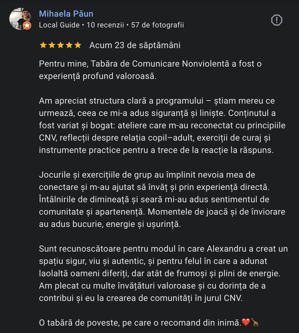 Am descoperit CNV din 2015 și am organizat prima tabără de CNV din 2017. În astfel de evenimente mă preocupă în mod special cum să creăm încredere și siguranță emoțională în comunitatea informală pe care o creăm. Îmi iau satisfacție când aud și văd participanții că se simt relaxați, liberi, acceptați și văzuți așa cum sunt.
