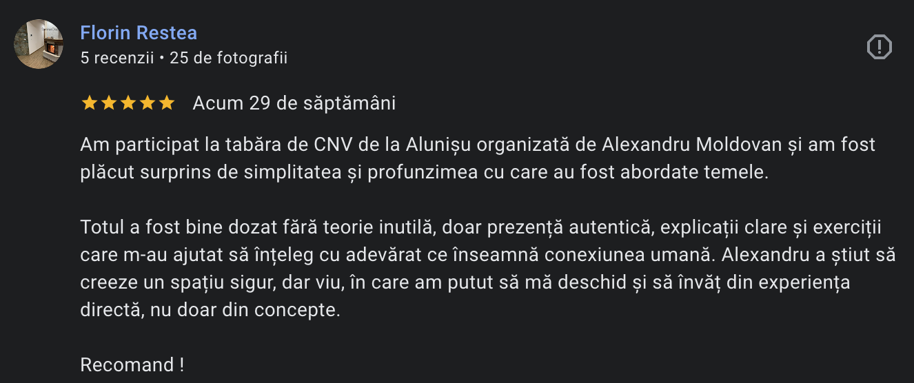 Mă numesc Alexandru Moldovan, trainer certificat în Comunicarea Nonviolentă din 2020 și lucrez de peste 20 de ani cu grupuri, echipe și persoane care își doresc relații mai autentice și mai pline de viață.